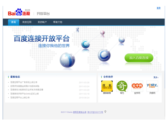 作为百度开放平台家族的新成员,百度连接开放平台基于OAuth2.0授权协议,向所有第三方开放了百度的账号体系、好友关系链以及相关产品线的核心数据接口。通过该平台,所有第三方网站只需通过百度账号就可以登录其网站,而百度应用开放平台的开发者还可以在其IFrame应用中获取百度登录用户的基本资料和好友关系等数据。目前,已有搜狐微博、奇艺网、拉手网、天极网等加入。