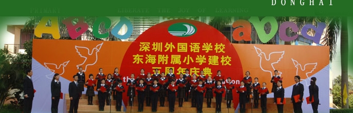 深圳外国语学校东海附属小学创办于2000年,坐落于深圳市香蜜湖西侧,是一所环境优美、设施齐备、师资精良、特色鲜明的现代化国有民办小学。学校由广东省一级学校、全国外国语学校工作研究会理事会学校、全国现代教育实验学校——深圳外国语学校独立承办,是深圳外国语学校的小学部。 学校现有多媒体课室 25 间,体育馆、图书馆、科学实验室、语音室、电脑室、音乐室、乐器室、舞蹈室、美劳室、手工制作室等专用课室一应俱全。学校现有教职员工近80名,是一支热爱教育事业、团结务实、敬业爱岗、富有奉献精神和创新意识的优秀教师队伍。 学校继承和发扬深圳外国语学校优良传统,以“把学校办成高质量、有特色的现代化学校”为办学目标,努力培养和造就既全面发展又具有外语特长的优秀小学生。形成了多方位、开放式、高质量的英语教学特色,目前有25个教学班,有包括美、加、日、韩、澳大利亚、港、澳、台等国家和地区的近1000名学生。学校始终坚持一切为了孩子的宗旨,全面实施和推进素质教育,求真务实,不断深化改革,不断实践创新,积极开展以爱国主义教育为核心的德育工作,致力于学生良好行为习惯的养成教育和健全人格的培养;积极探索新的课程理念,不断深化教学改革,全面提高教学质量;坚持探索开放式的办学模式,重视对外文化交流,先后与美国、加拿大、日本、香港等国家和地区的学校建立了友好往来关系;努力创设高品质的校园文化,营造积极向上、健康、和谐的育人环境,让学生快乐健康成长。 学校不断优化课程设置,除基础课程外,还积极开设形式多样的第二课堂活动,现有棋类、园艺、编织、武术、语言艺术、国画、书法、器乐等50多个项目,为学生提供了广阔的培养特长、发展个性的空间。除此之外,学校还广泛开展丰富多彩的校园文化活动,每年定期举办外语节、艺术节、科技节、体育节。扎实的基础教育与丰富的文体兴趣活动相结合,促进了学生素质的全面发展。生动活泼、积极向上、文明守纪、乐思创新、勤奋好学的优良校风和学风已经形成。近年来,学生参加各级各类比赛,捷报频传:如参加国际奥林匹克机器人大赛获得银奖、参加全国小学生英语口语比赛获得特等奖、参加全国中小学生英语能力大赛获得一等奖、参加国际少年儿童舞蹈大赛获得第三名。学校先进的办学理念、科学规范的管理、以及优良的教育教学质量,赢得了家长、社会的广泛赞誉。
